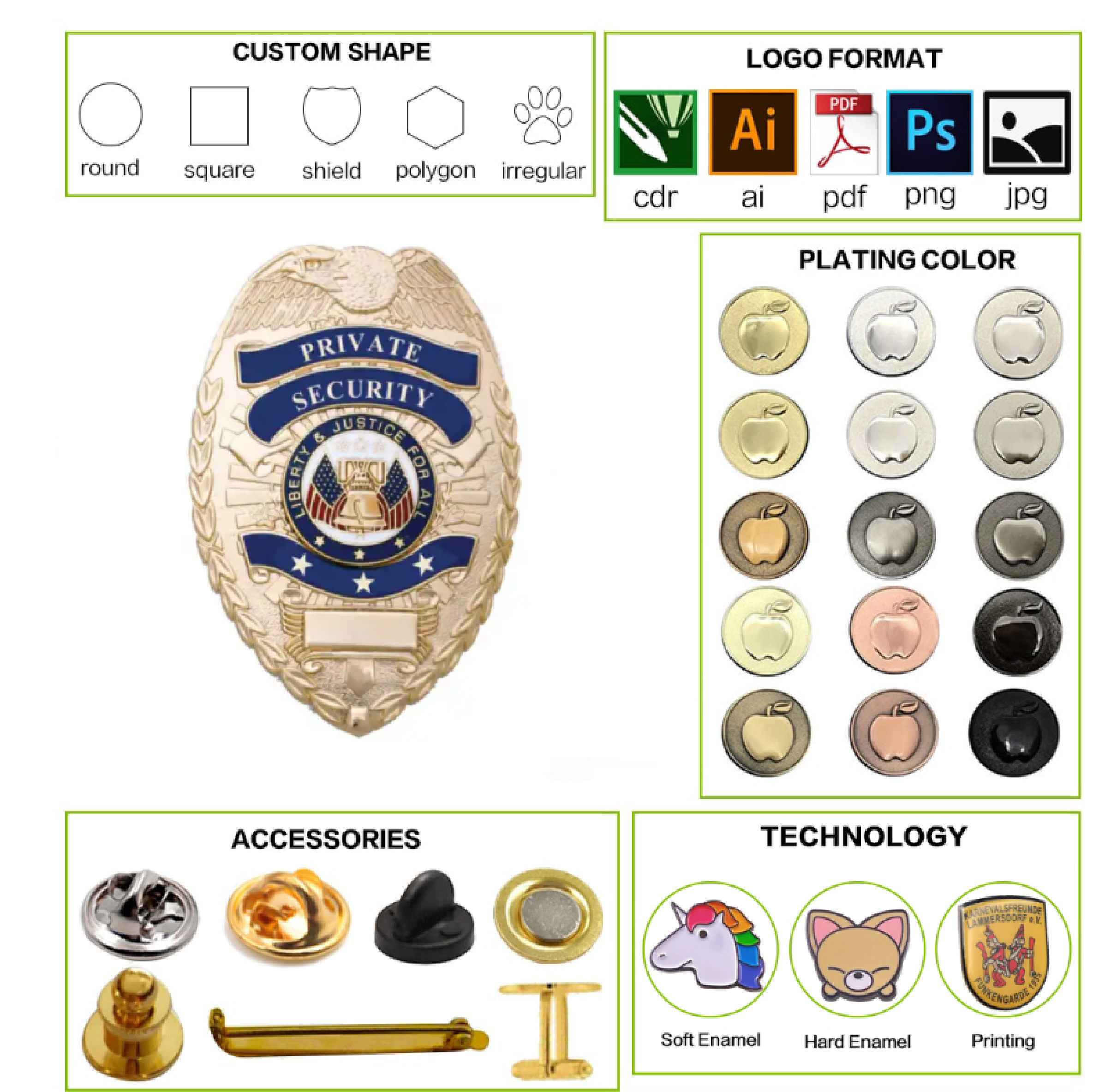 | Color craft | Soft enamel, Imitation hard enamel, Hard enamel, Silk screen, CMYK printing, Epoxy |